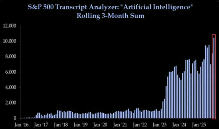 “AI” mentions during S&P 500 earnings calls this quarter have surpassed 10,000 for the first time in history. This figure has DOUBLED over the last 18 months. To put this into perspective, “AI” was cited just ~1,000 times during the 3-month period ending March 2023.