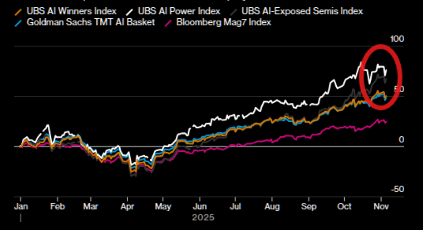 While the Mag-7 is up 25% YTD, the real eye-watering gains have been in the bank AI baskets which are up 50-75%.