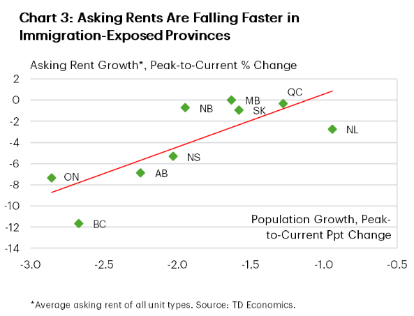 “Reduced immigration has moderated demand for purpose-built rentals and, consequently, rent growth. We estimate rent growth will likely average 2 percentage points (ppts) lower than the counterfactual scenario of maintaining higher population growth. Condo asking rents are also falling fastest in jurisdictions most exposed to immigration changes.”
