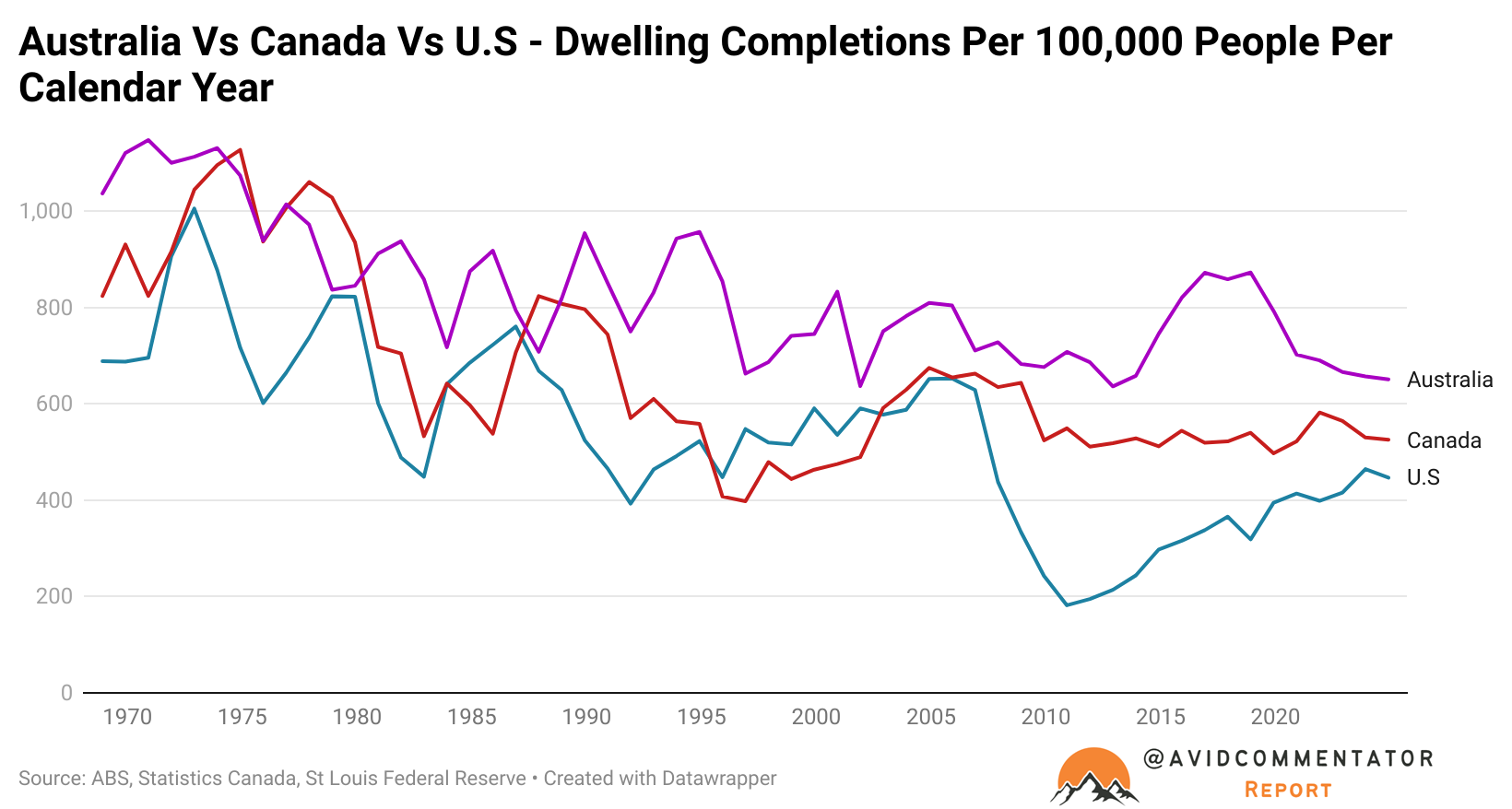 Australia actually does a very good job in building homes in per capita terms, outbuilding its peers across the Anglosphere, despite the fact that completions are depressed compared with historic domestic norms.
