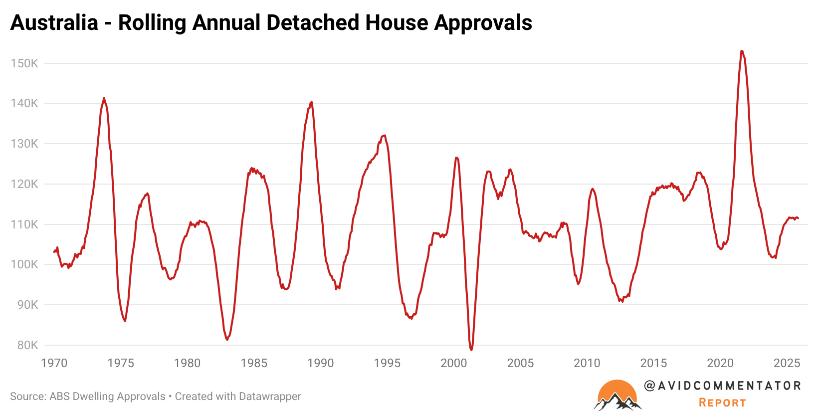 As of the latest building approvals data from the ABS, in the last 12 months, 111,500 detached houses were approved for construction.