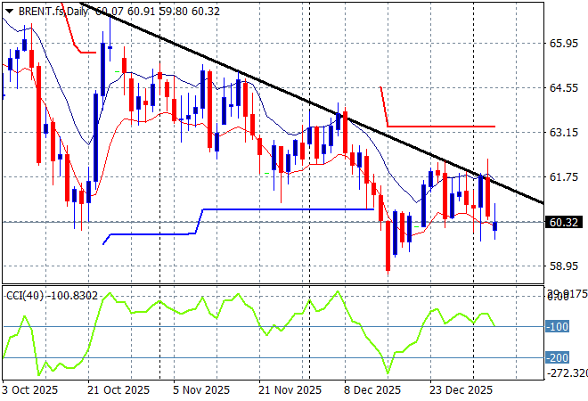 Oil markets have been on a multi week/monthly downtrend prior to all the Venezuelan invasion with Brent crude and a potential rally was brewing but reality – that it will take months or years to actually physically change the output of heavy crude – is setting in, as it fell back to $60USD per barrel again overnight.
