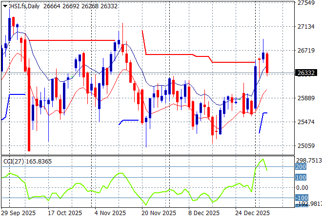 Looking at stock markets from Asia from yesterday’s session, where mainland Chinese share markets were a bit wobbly going into the afternoon session with the Shanghai Composite down slightly but still above 4000 points while the Hang Seng Index has snapped back, falling nearly 1% lower to 26458 points.