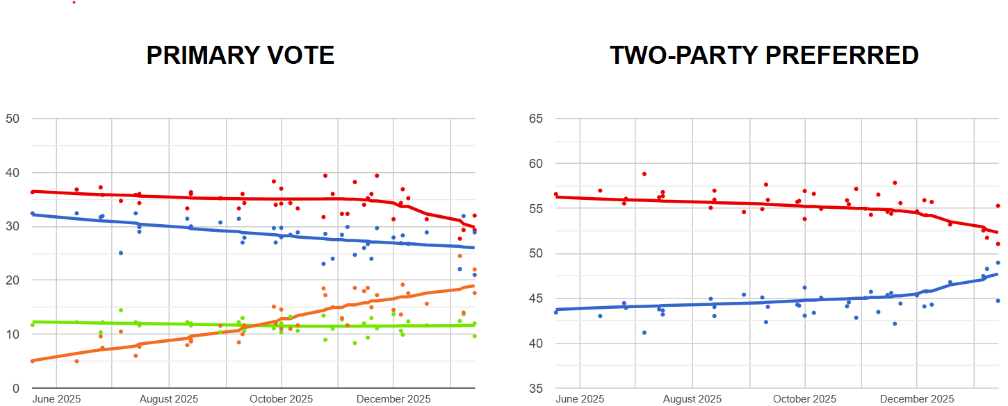 …The combined primary vote of 53 per cent for Labor and the Coalition is the lowest level for the major parties in Newspoll history, with 47 per cent of Australians now backing One Nation, the Greens, independents and minor parties. Labor’s two-party-preferred vote lead over the Coalition also fell to its lowest level since last year’s election at 55-45 per cent. The ALP’s 2PP lead mirrors the result of the May 3 poll.