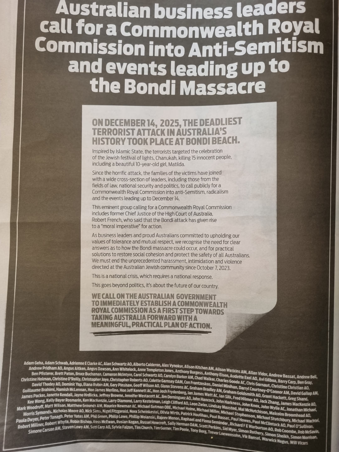 On Friday 2 January 2026 every major media outlet in the country was running the news that 120 Australian Business leaders were calling for the Federal Government to call a Commonwealth Royal Commission into the Bondi Shootings and Anti-Semitism in Australia.