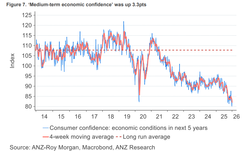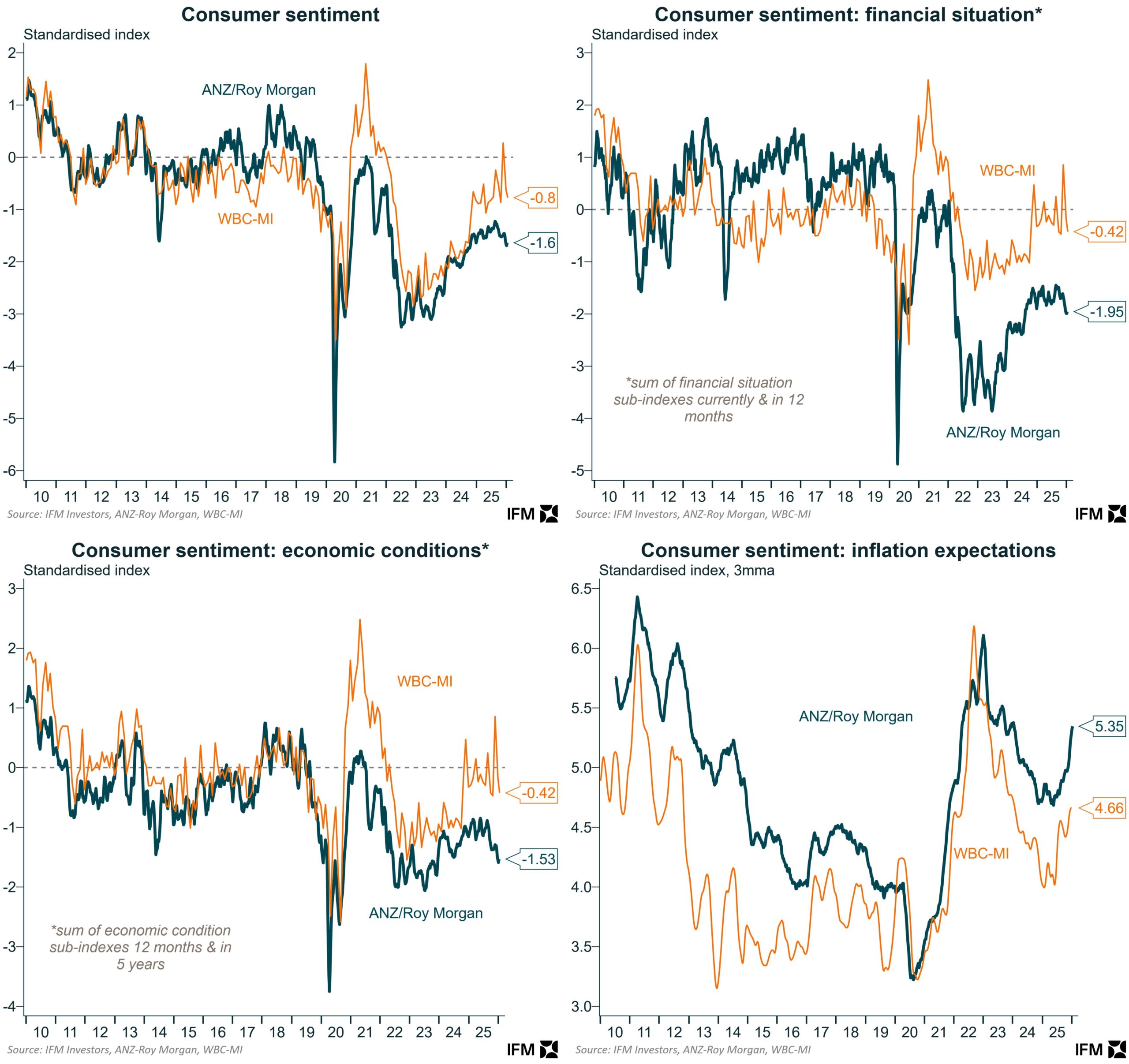“The WBC-MI consumer sentiment measure has been volatile in recent months but is seemingly turning over similar to the much more timely and pessimistic ANZ-RM index. “