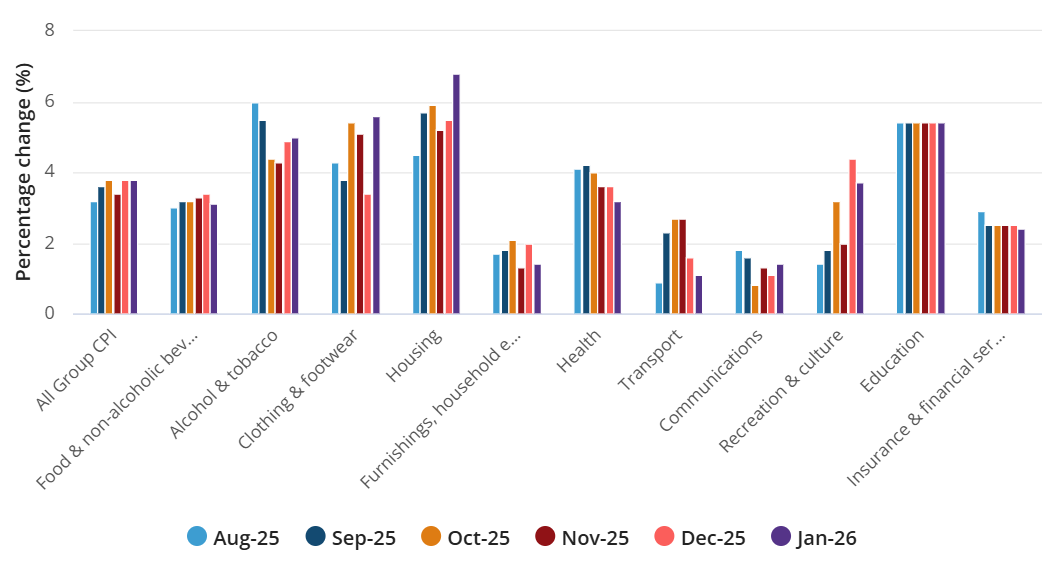 Instead, health, education, booze and smokes are skyrocketing higher.