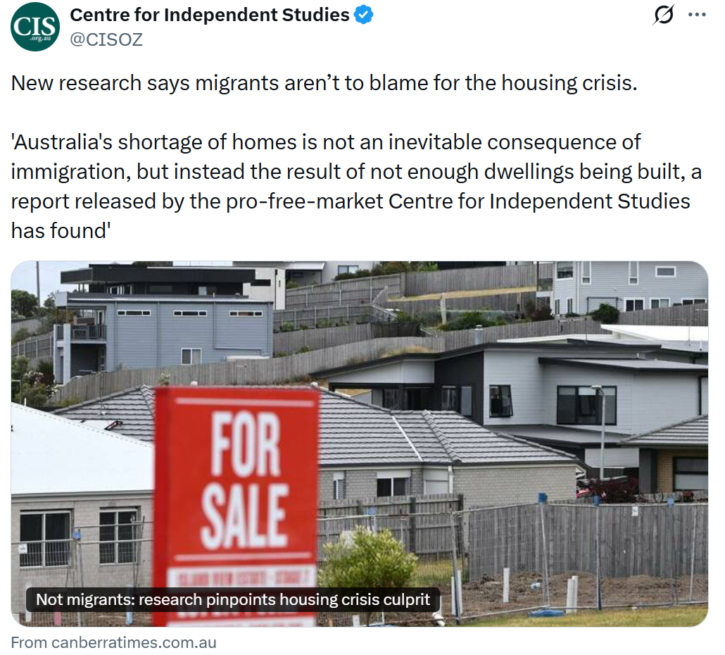 The supply-side nutters at the Centre for Independent Studies have produced “research” showing that “migrants aren’t to blame for the housing crisis”. Instead, the CIS argues that Australia’s housing shortage is “the result of not enough dwellings being built”: