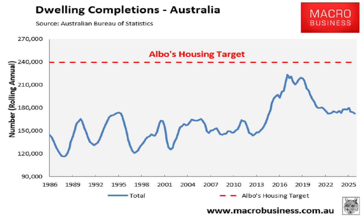 As a result, the Albanese government’s 1.2 million housing target, which is already tracking 27% below its required run rate, risks falling even further behind.