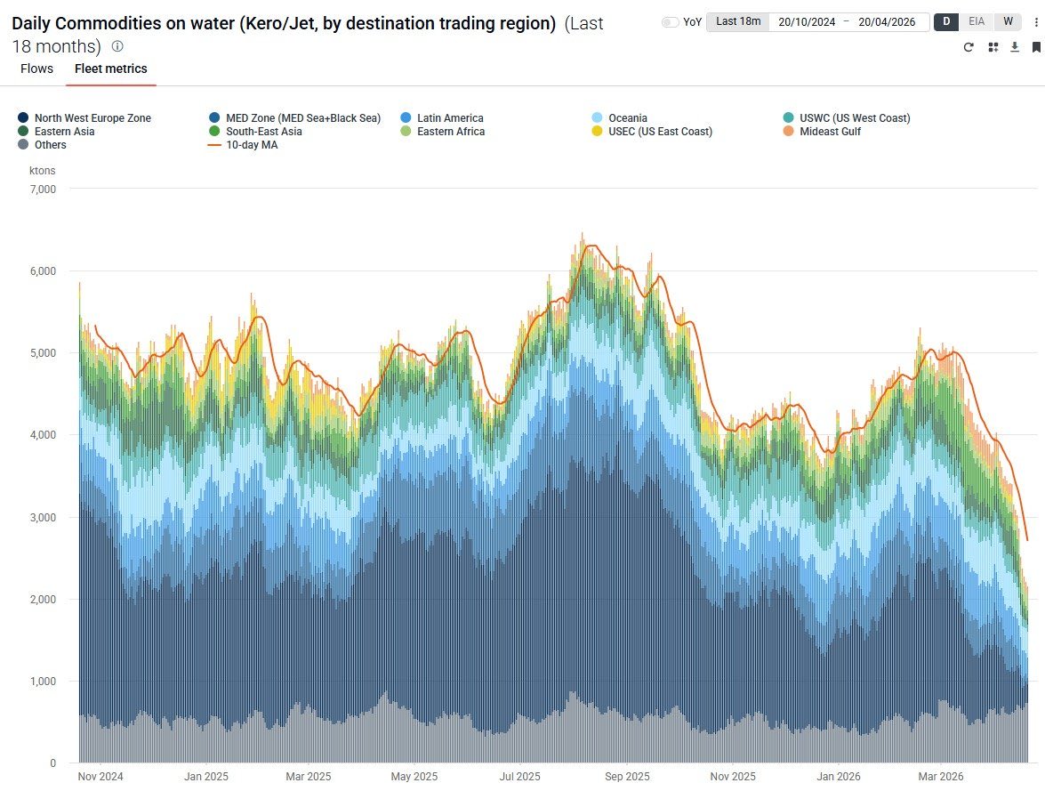 Now that the conflict has been underway for nearly two months, the impact of plummeting exports is starting to show up dramatically in the total amount of jet fuel/kerosene on the water to be delivered to ports across the globe.